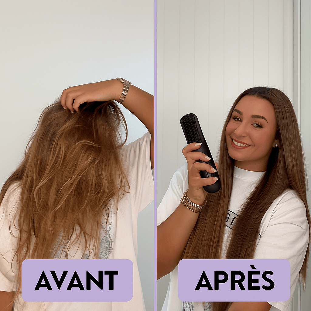 Tous types de cheveux ! Fins, épais, frisés, légers ou densifiés — même les cheveux en période de changement (ménopause, perte de densité). Il suffit d’ajuster doucement la brosse pour respecter la texture spécifique.